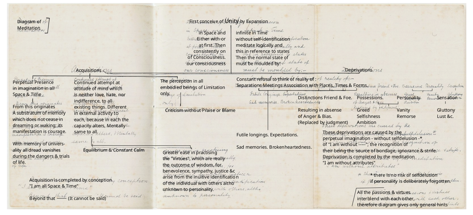 In "Insight", Journal of the Theosophical Society in England, February 2017, Vol 52 No 5, in the article of Janet Hoult, "A Brief History of the Esoteric Section, the Diagram of Meditation and E.T. Sturdy", pages 12-16, we find on pages 14-15 a picture of the Diagram of Meditation as it was recorded by E.T. Sturdy. At first sight, there seem to be a number of differences in comparison to the usual editions of the diagram. On the basis of the image of the diagram I have retyped the diagram, and made a simple new Dutch translation of it.