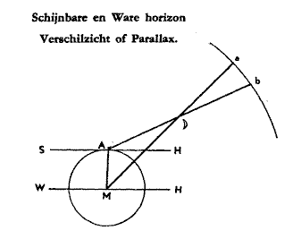 Een voorbeeld uit de brief van Dhr. van Lent. De ondergang van de Maan op 9 februari 1993 te Utrecht, 52°05'NB, 5°08' OL vindt plaats om 8 uur 38 MET. De met het programma Scorpio met ware plaats berekende geocentrische Maan staat dan op 4°49' Maagd. De descendant is op dat moment 4°2' Maagd, een verschil van 41'. Dit verschil zou wellicht verklaard kunnen worden uit de bovengenoemde afwijkingen. De met ware plaats berekende topocentrische Maan staat op dat moment op 1°12' Maagd. Dit is een verschil van -3°47' met de descendant. Passen we vervolgens nog de bovengenoemde correcties toe: diameter maan + refractie + kimduiking = +16' + 34' + 0' = +50'. De standhoek van de ecliptica in aanmerking genomen wordt dit verschil ongeveer +56' in lengte. Dit levert: